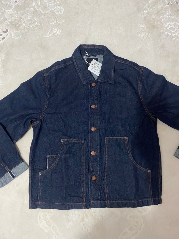 Düğmeli, yakalı lacivert denim ceket, uzun kollu, normal boyda ve rahat kesim. Kalın ve kaliteli kumaştan yapılmış. M beden , etiketli ürün hiç kullanılmadı.