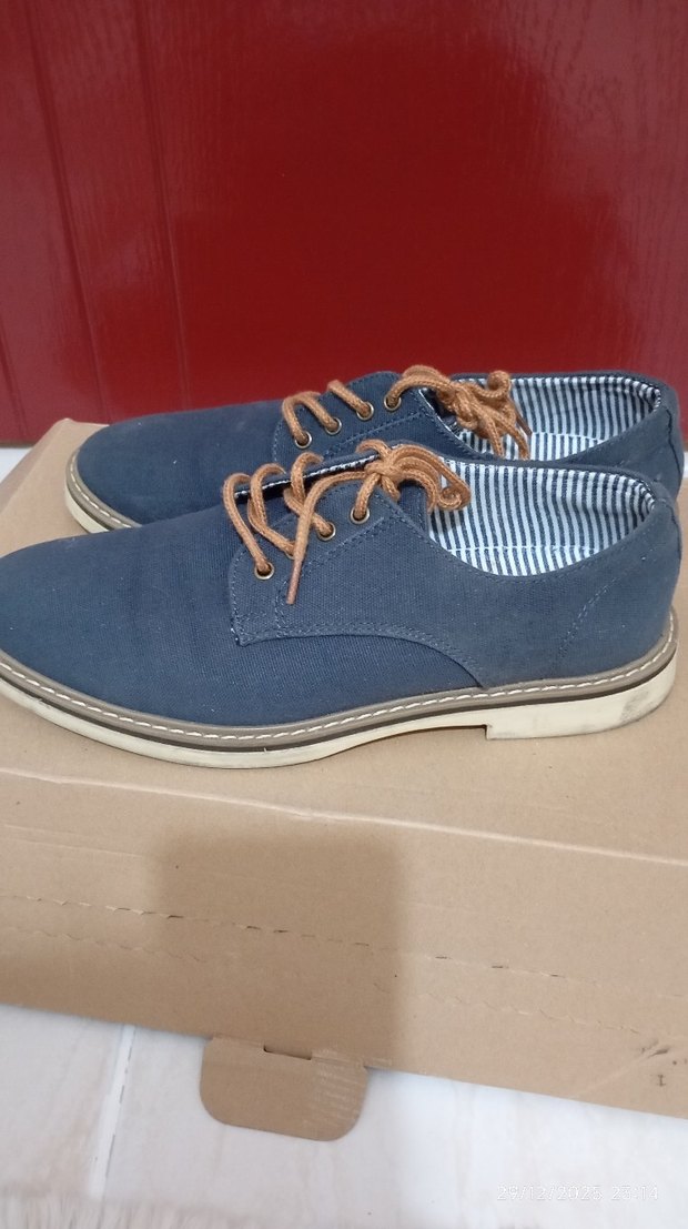 Mavi kot kumaştan yapılmış, kahverengi bağcıklı ve rahat tabanlı erkek klasik ayakkabı, günlük kullanım içinde uygun. oğlum sadece bir kez düğünde giydi sıfır sayılır