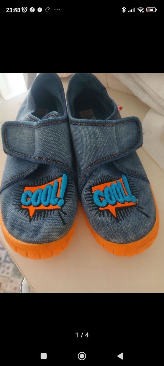Mavi kot kumaştan, renkli baskılı ve Velcro bantlı erkek çocuk ev terliği. Üstünde "cool!" yazısı bulunur. Rahat sokak stili için uygundur.
