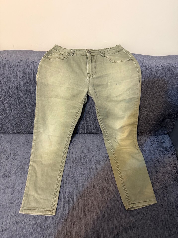 Haki yeşili. Ufak tefek bir iki lekesi bulunuyor. Alt kısmında deformeden dolayı dikiş yapılmıştı. Haki renkte, düğmeli ve rahat kesim erkek kot pantolon. Normal boyda ve günlük kullanıma uygun..
