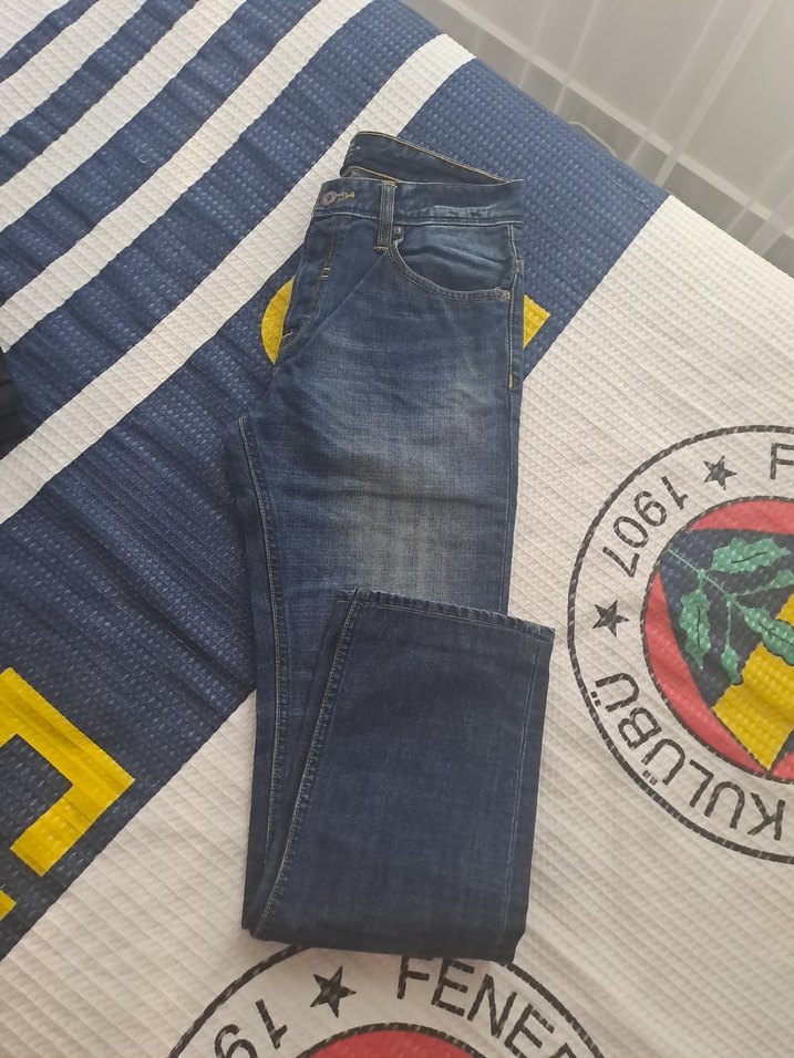 mavi batik desenli, regular fit erkek kot pantolon. Denim kumaştan, günlük sokak stili için uygundur.