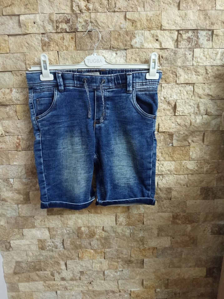 Tokalı detaylı, fitted kesim mavi kot şort. Erkekler için streetwear tarzında, desensiz ve trend bir görünüm sunar. etikette 74 yazıyor bel ölçüsü sanırım