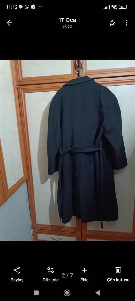 Erkekler için koyu gri enkte, kemerli uzun kesim ve uzun kollu minimal tarzda palto. Yumuşak ve sıcak kumaştan üretilmiştir. iki koltuk arası 67 omuzdan boy 118