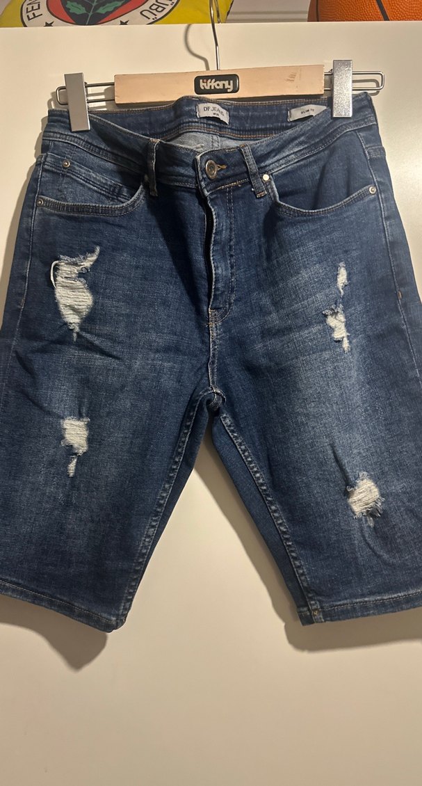Koyu mavi renkli, bol kesim ve kemerli bel detaylı denim şort. Yıpratılmış dokunuşlarıyla sokak stiline uygun, günlük kullanıma elverişli.