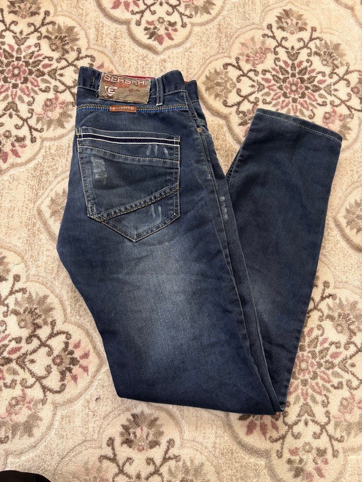 Koyu mavi kot pantolon, bol kesim ve normal boyda, kemerli bel ile günlük rahat kullanım için uygundur. Sokak stili için ideal. Bel 41 boy 105