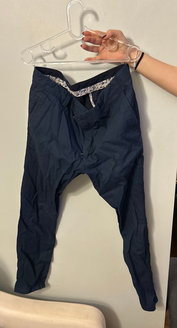 Erkekler için koyu mavi denimden bol kesim, normal boy pantolon. Tokalı detay ve günlük kullanıma uygun rahat sokak stili.