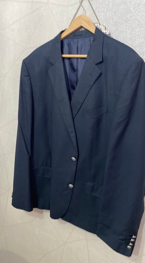 Erkek takım elbise ceketi, koyu mavi renkte, düğmeli ve klasik kesime sahip. Uzun kollu ve desen içermeyen sade tasarımıyla ofis kullanımı için uygundur. Lacivert