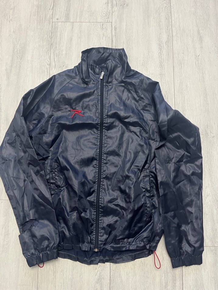Erkekler için koyu mavi, fermuarlı ve yüksek yakalı yağmurluk. Sentetik kumaştan, uzun kollu ve sportif şık kullanıma uygun. ️