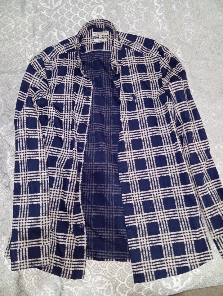 Uzun kollu, düğmeli ve çentikli yakalı erkek gömleği. Koyu mavi kareli desenli, günlük rahat kullanım için uygun.
