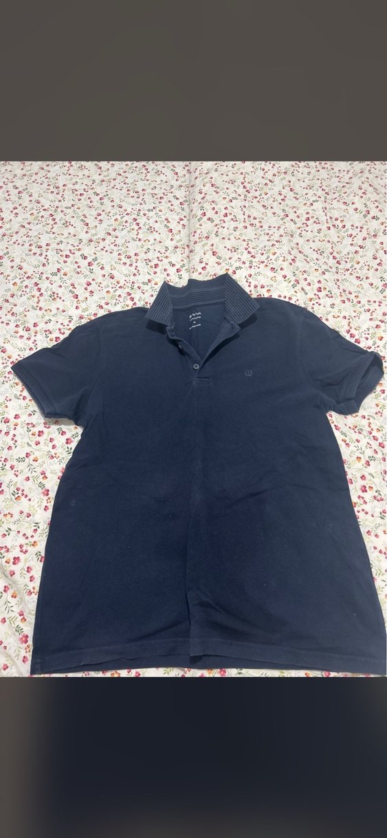 Erkekler için koyu mavi, kısa kollu, yakalı ve düğmeli pamuklu polo tişört. Günlük rahat ve şık sokak stili için uygundur.