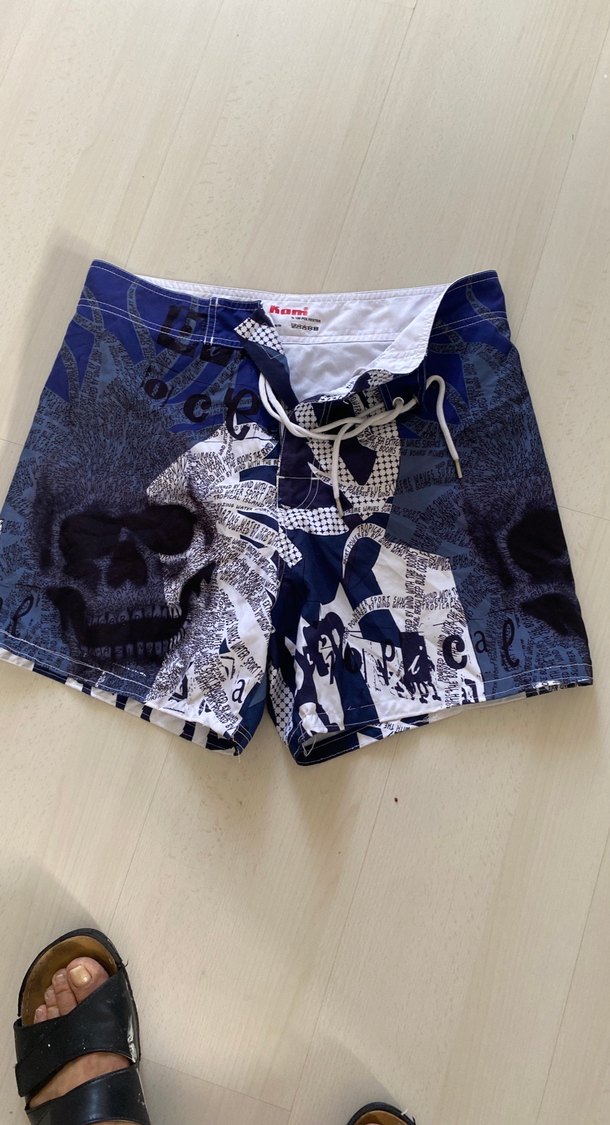Erkekler için koyu mavi baskılı, kemerli, mini kesim, fit mayo şortu. Plajda rock punk havası için ideal.