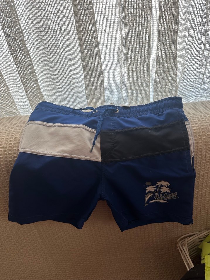 Erkek 8 yaş çocuk için koyu mavi renk bloklu mini şort mayo. Plaj ve günlük sokak stiline uygun.