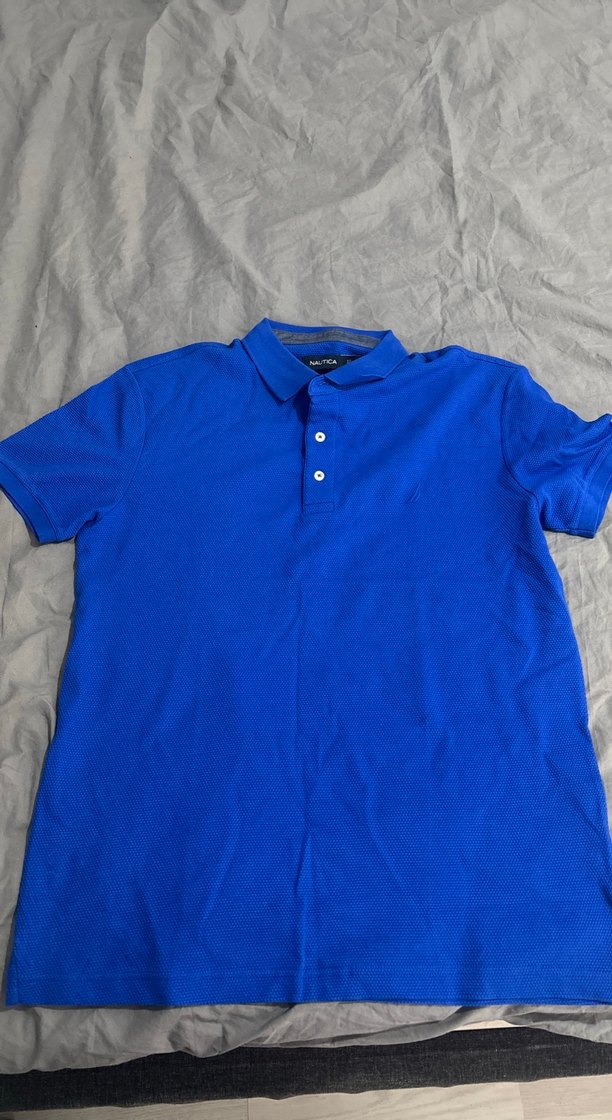 Erkekler için koyu mavi renkli, yakalı ve kısa kollu polo tişört. Düğmeli, vücuda oturan kesime ve normal boyda, sentetik dokulu kumaştan üretilmiştir. Sokak stiline uygundur.