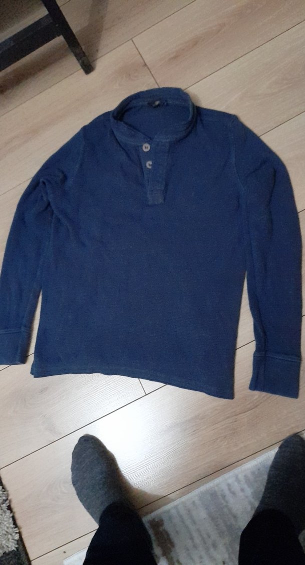 S Beden Erkek için uzun kollu, düğmeli ve yuvarlak yakalı koyu mavi denim gömlek. Rahat kesimi ve sade deseniyle trend bir günlük stil sunar.