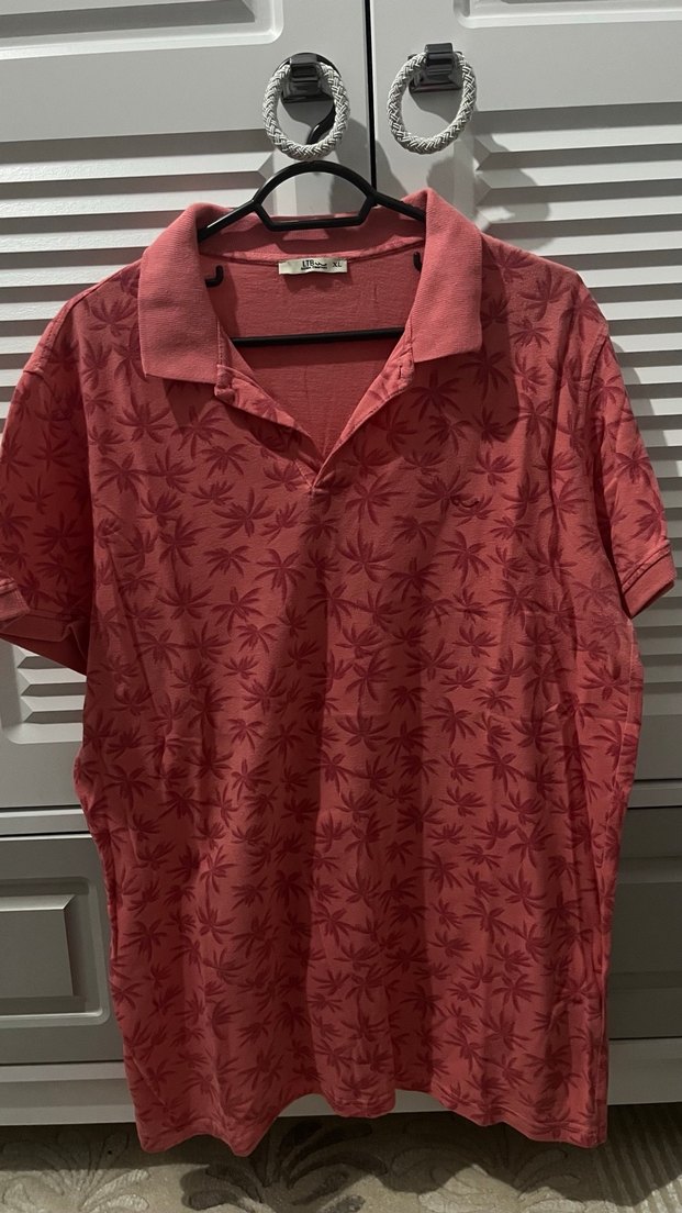 Koyu pembe erkek polo tişört, kısa kollu ve yakalı, düğmeli ön detaylı ve bol kesim. Yumuşak sentetik kumaştan, hafif batik desenli, rahat sokak stili için uygun.