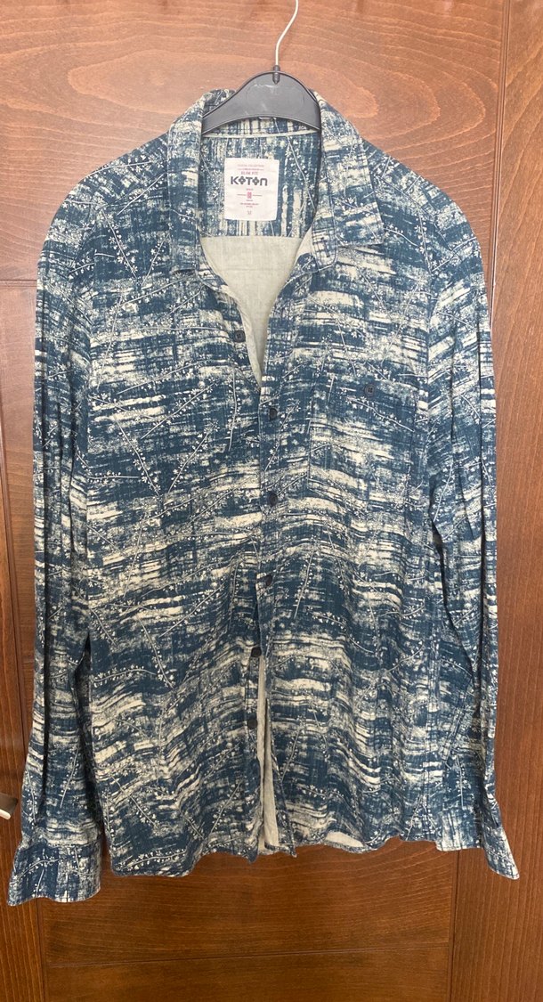 Erkek gömlek, uzun kollu ve yakasında çentikli yaka bulunur. Düğmeli, bol kesim ve uzun boylu, sentetik kumaştan gri batik desenlidir. Rahat günlük kullanım için uygundur.