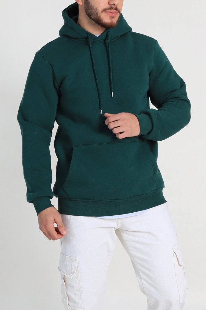 Erkekler için koyu yeşil, kapüşonlu ve uzun kollu sweatshirt. Rahat kesimi ve normal boyu ile günlük kullanıma uygun, yumuşak ve sıcak kumaştan üretilmiştir.