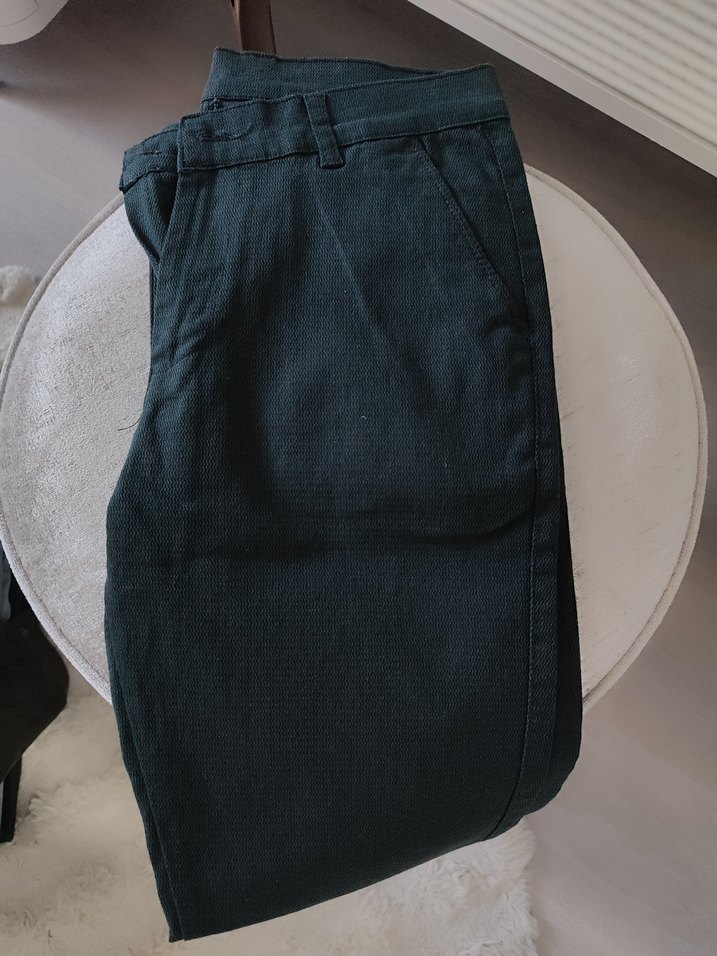 Erkekler için koyu yeşil keten pantolon, normal boy ve rahat kesimle günlük kullanıma uygun sade ve şık bir görünüme sahiptir.