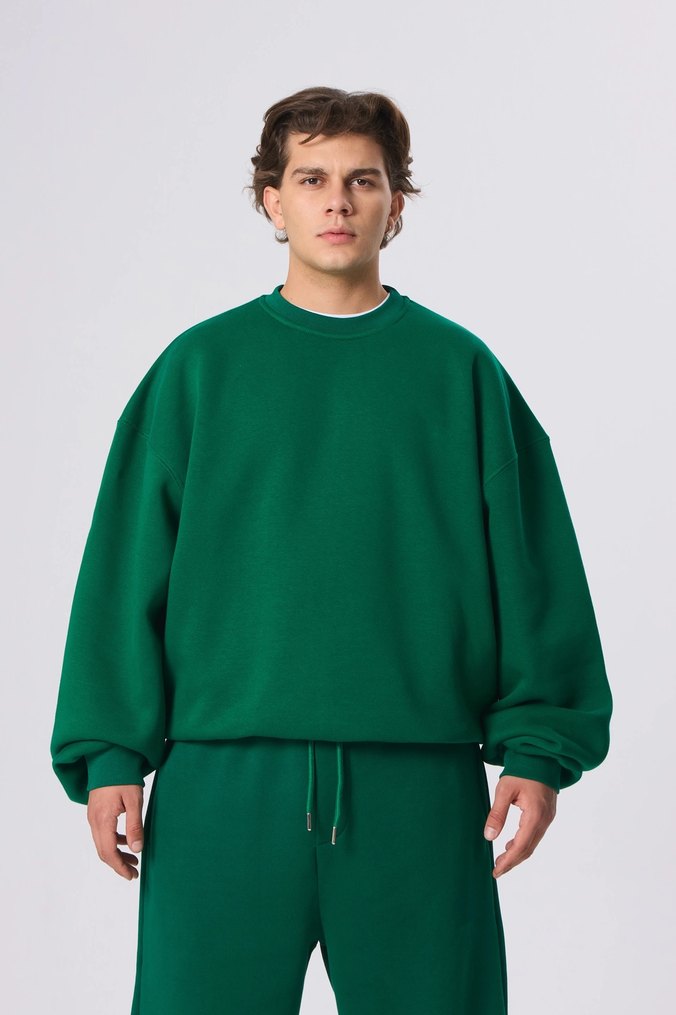 Erkekler için koyu yeşil, oversize kesim ve uzun kollu sweatshirt. Yuvarlak yakalı, yumuşak ve sıcak kumaştan günlük şık bir parça. L beden