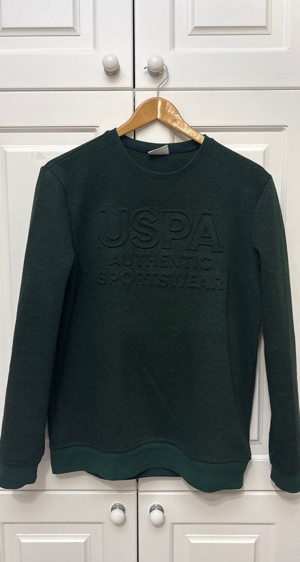 Koyu yeşil renkte, yuvarlak yaka ve uzun kollu erkek sweatshirtü. Yumuşak ve sıcak kumaştan, önde kabartmalı USPA logosu ile rahat bir tarz sunar.
