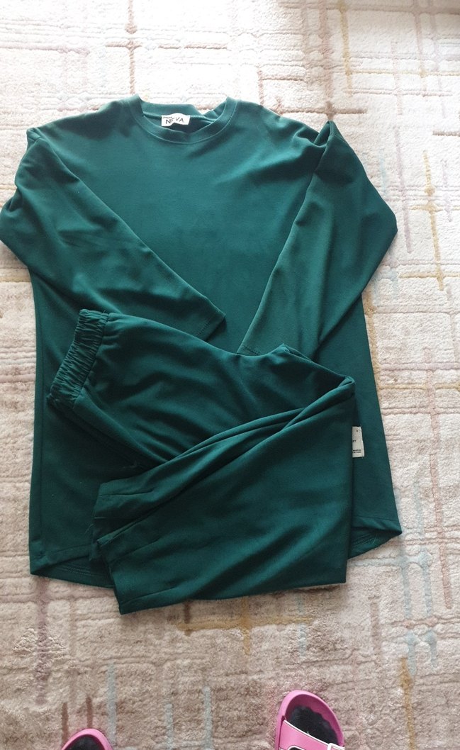 Erkek pijama takımı, uzun kollu ve bisiklet yaka, koyu yeşil renkte, rahat ve salaş kesimle sade bir şıklık sunar.