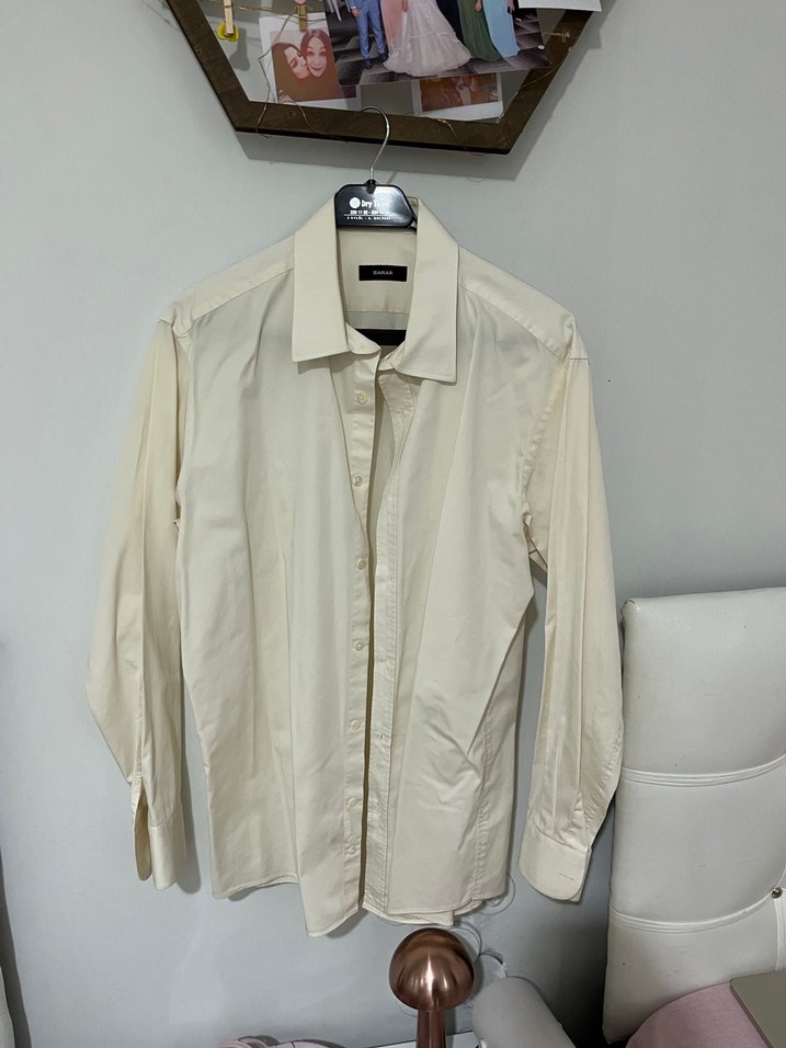 Erkekler için kremrengi kumaştan, uzun kollu, yakalı ve düğmeli klasik kesim gömlek. Ofis ve günlük kullanıma uygundur.