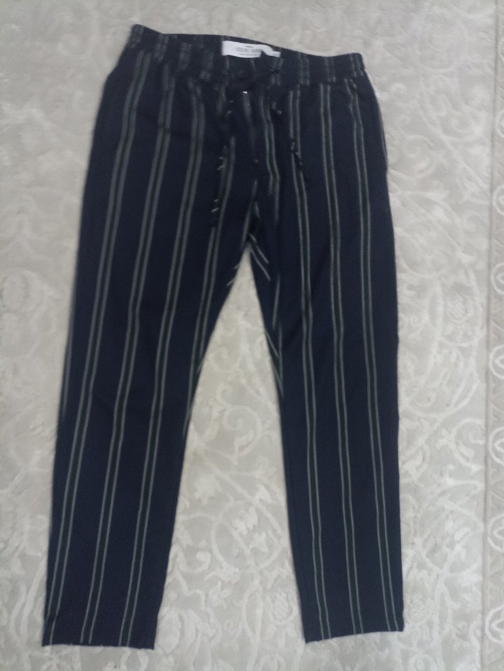 Erkek için çizgili, beli lastikli kumaş pantolon. Normal boy ve regular fit, sentetik kumaştan, günlük sokak stili için uygun.