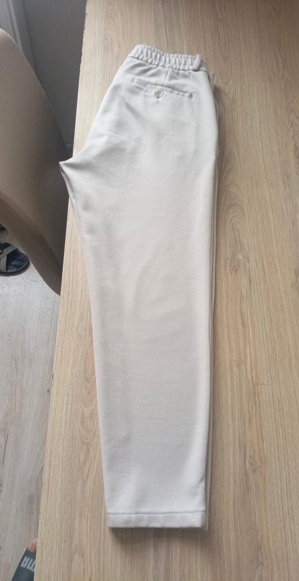 Erkekler için düzenli kesim, dökümlü tasarıma sahip, yumuşak sentetik kumaştan yapılmış beyaz midi uzunluğunda pantolon. Günlük kullanım için minimalist tarzda uygundur.