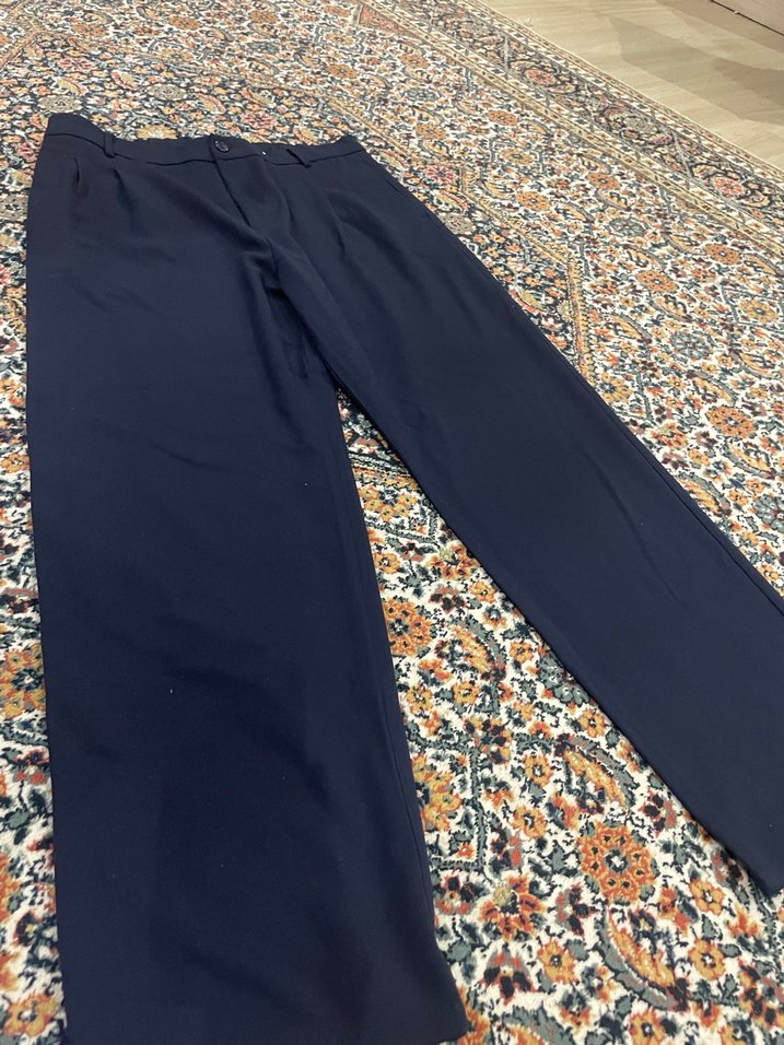koyu mavi kumaş pantolon, regular fit ve pilili tasarıma sahip. Ofis kullanımı için ideal ve desen içermeyen şık görünüm sunar.