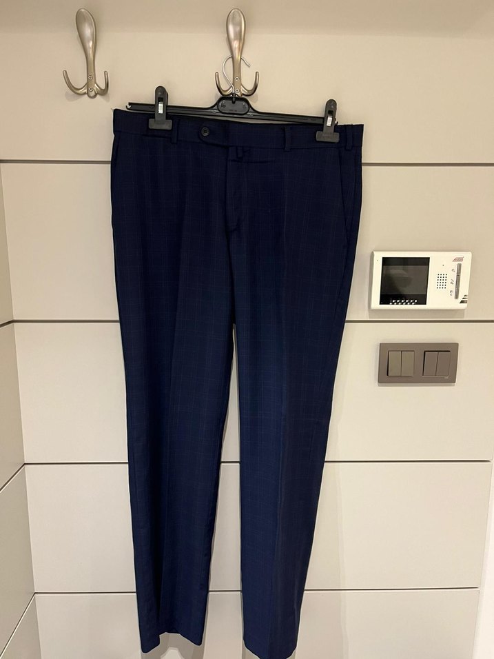 Erkek lacivert pantolon, takim elbise pantolonuydu kac beden hatirlamiyorum.bel ölçüsü görselde olduğu gibi olctugumde 45 cm boy uzunluğu 99 cm.Kigılı markasina aittir.
