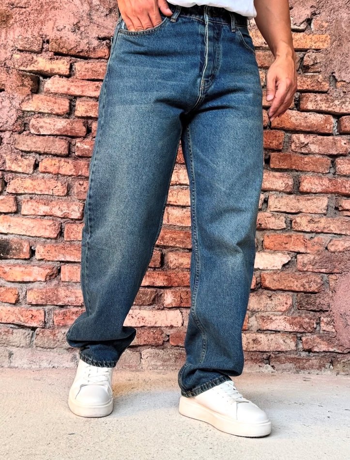 Erkekler için Laci denimden, Baggy kesim ve normal boyda jean pantolon. Günlük kullanımda rahat ve şık bir sokak stili sunar. Baçada çok ufak yırtık var