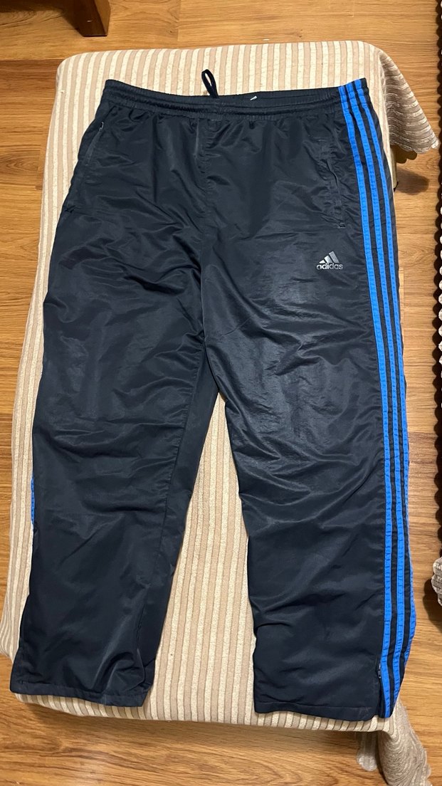 Lacivert renkli, yanları mavi şeritli Adidas marka erkek eşofman altı. Sentetik kumaştan, ayarlanabilir Velcro detaylı, trend sokak stili için uygundur.