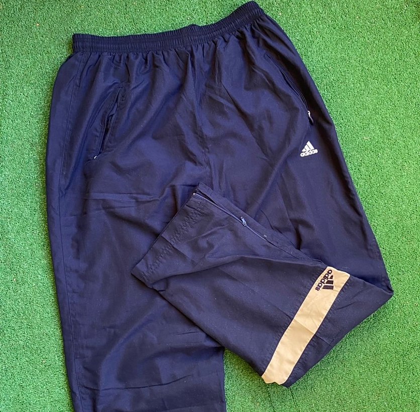 Lacivert Adidas, bol kesim, fermuarlı cepli ve sentetik kumaşlı erkek eşofman altı, trend sokak giyimi için uygun.