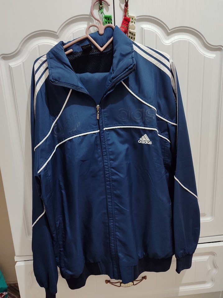 Fermuarlı ve yüksek yakalı, lacivert erkek eşofmanu Sentetik kumaştan, spor ve günlük sokak stiline uygun, Adidas markalı. sıfırdır beden uymadığı için hiç giyilmedi