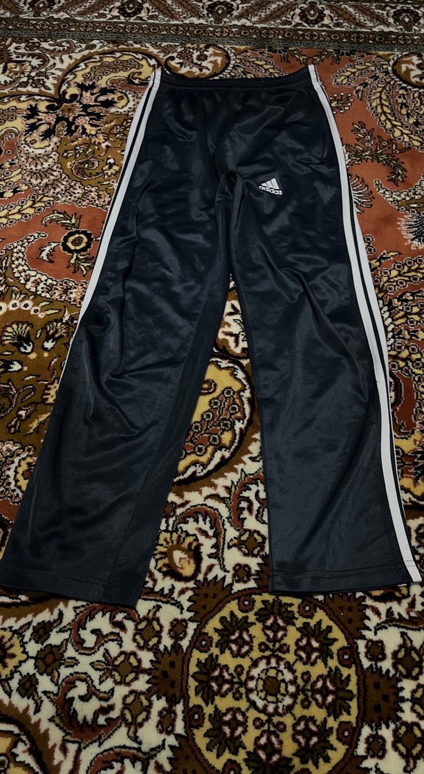 Lacivert Adidas eşofman, rahat kesim ve yan çizgilerle. Kaygan sentetik kumaştan, fermuarlı ceplerle. Trendy günlük stil için uygun.