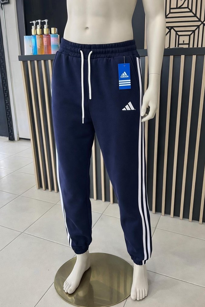 Erkekler için koyu lacivert Adidas eşofman altı, rahat kesim ve normal boyda. Yumuşak kumaş, baskılı şeritler ve cırt cırtlı detay içerir. Spor ve sokak stili için uygun.