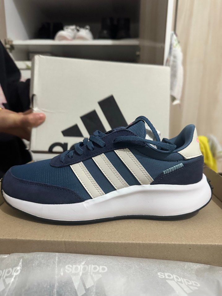 Lacivert ve beyaz detaylı, kauçuk tabanlı Adidas spor ayakkabısı, rahat ve şık bir görünüm sunar.