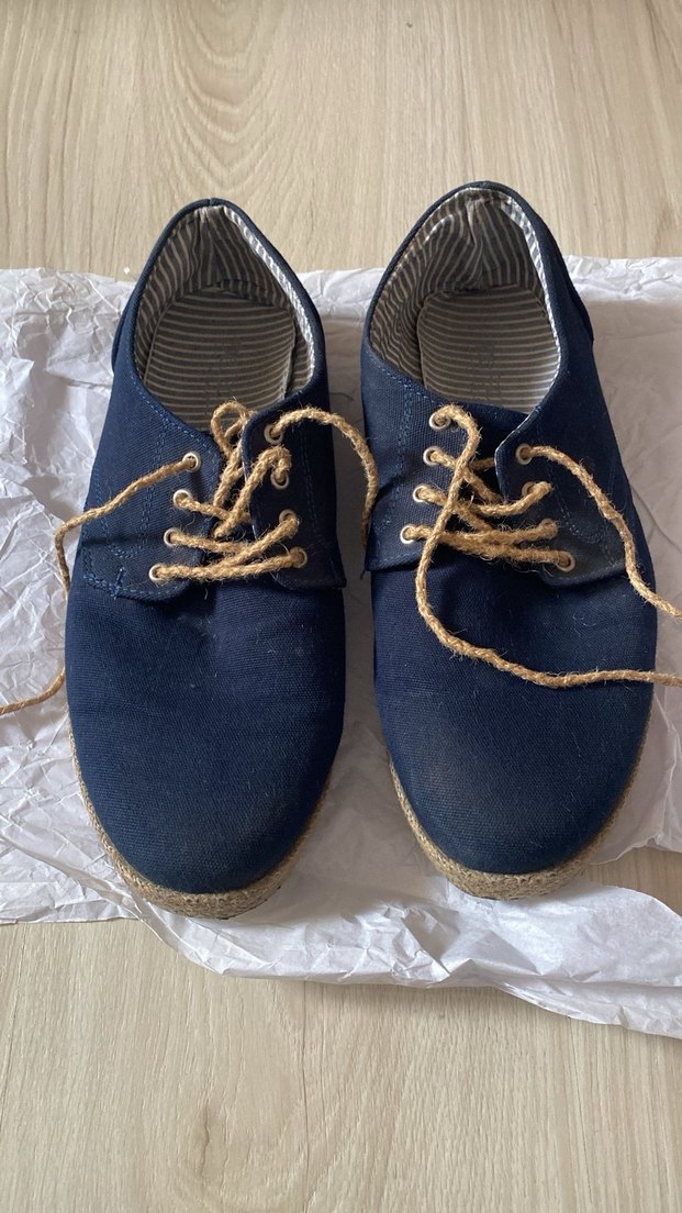 Erkek ayakkabıları, lacivert renkte minimalist normcore tarzında, doğal renk bağcıklarla. İç kısmı gri çizgili astarlıdır.