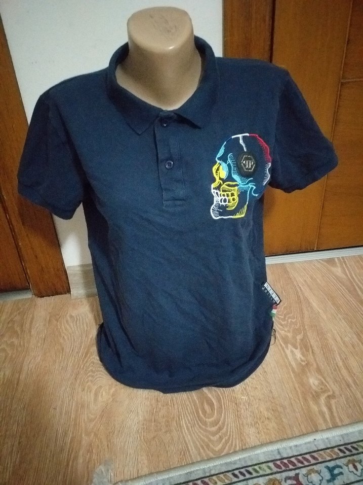 Erkekler için kısa kollu, yakalı, düğmeli, fitted kesim denim polo tişört. Lacivert renkte, göğüs kısmında renkli kafatası baskısı bulunur. Günlük kullanıma uygun.