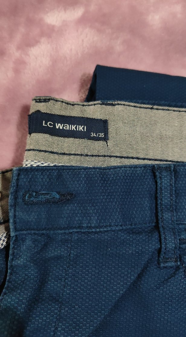 Erkekler için koyu mavi baskılı desenli, kemerli ve regular fit kısa denim pantolon. LC Waikiki, 34/35 beden.