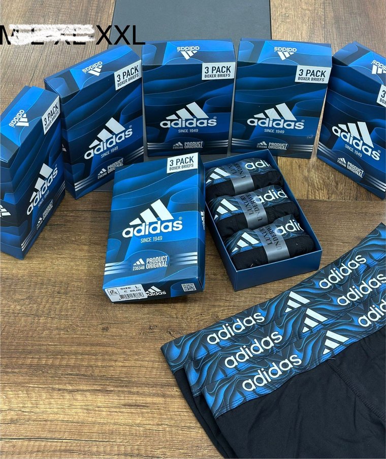 Erkekler için baskılı, lacivert renkli, kısa kesim ve dar kesim boxer, Adidas 3'lü paket içinde. Rahat ve sportif athleisure tarzı.