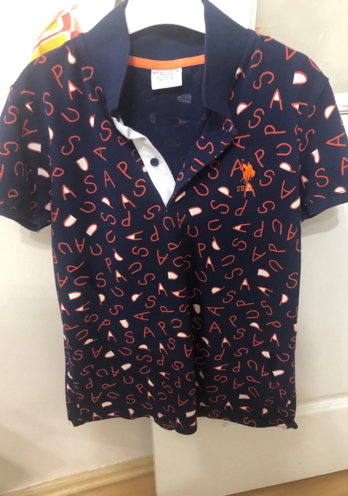 Erkekler için lacivert baskılı, düğmeli, yakalı ve bol kesim kısa kollu polo tişörttür. Sentetik kumaştan yapılmıştır, sokak tarzına uygundur.