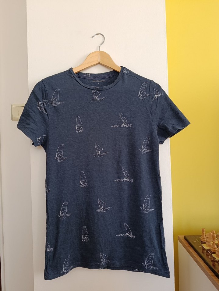 Lacivert baskılı yelkenli desenli, kısa kollu, bisiklet yaka, bol kesim pamuk kumaştan erkek tişörtü, rahat sokak stiline uygun.