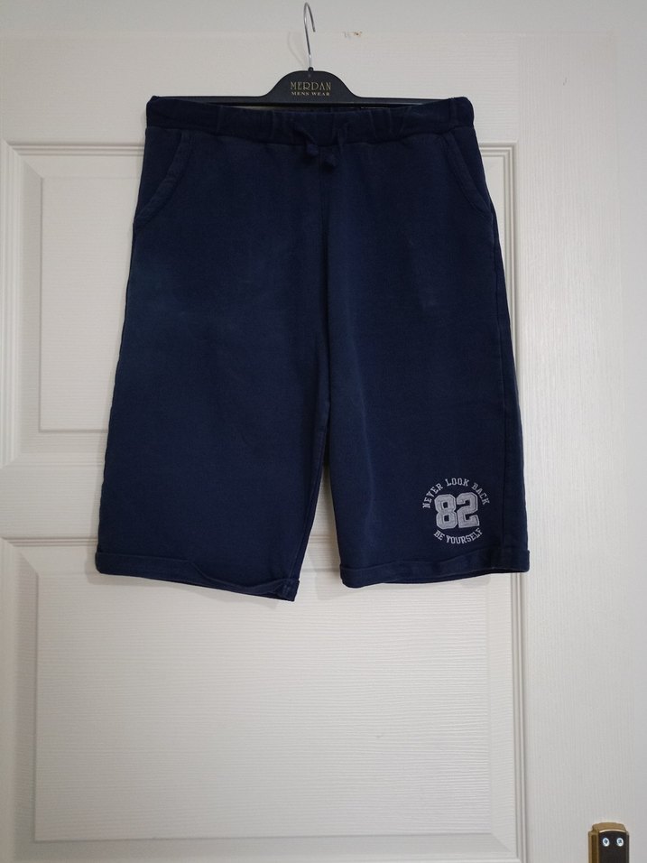 Erkekler için lacivert, baskılı ve kemerli rahat kesim şort. Yumuşak ve sıcak kumaştan üretilmiştir, günlük sokak tarzına uygundur.