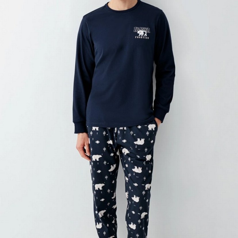 Erkekler için, lacivert uzun kollu, bisiklet yaka üst ve baskılı, bol kesim pantolonlardan oluşan rahat pijama takımı. Alaska model