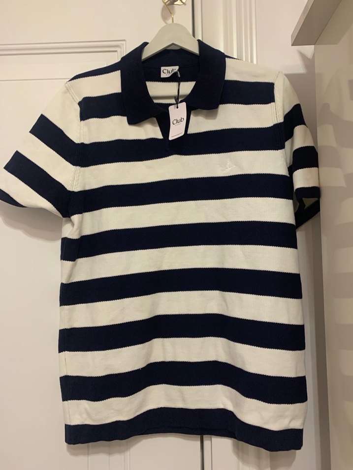 Erkekler için pamuklu, kısa kollu, düğmeli, yakalı ve bol kesim lacivert beyaz çizgili polo tişört. Günlük rahat kullanım için uygundur.