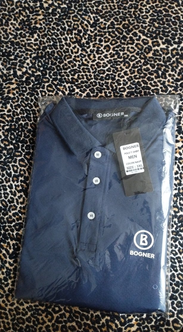 Erkekler için dar kesim lacivert polo yaka tişört, kısa kollu ve düğmeli. Sentetik kumaştan ve baskılı desene sahip. Günlük ve iş stiline uygun. Bogner markalı.