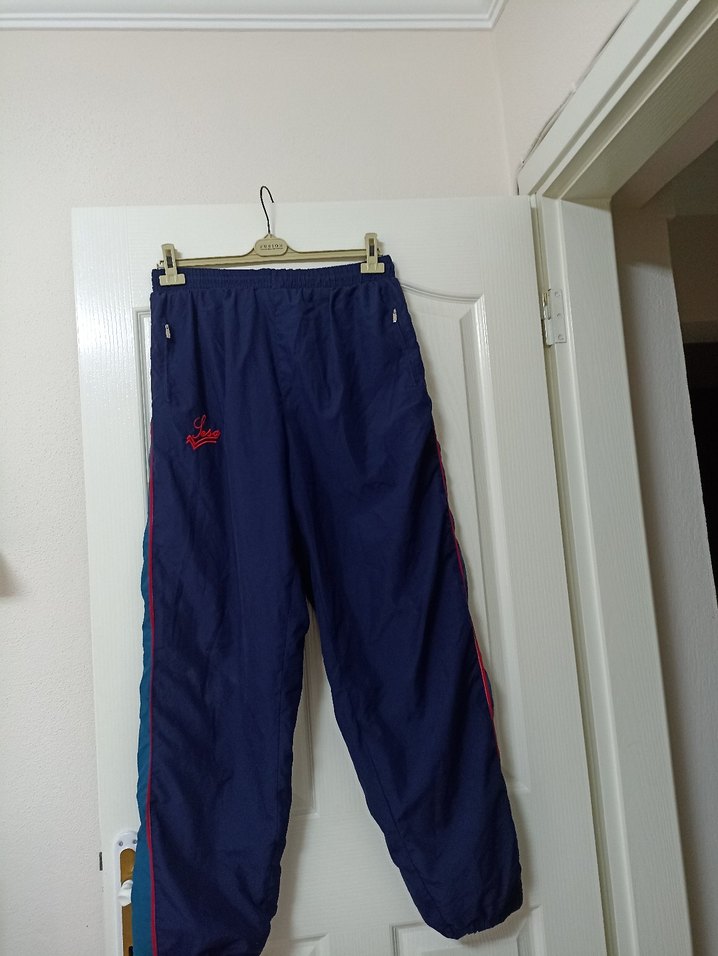 Lacivert renkte, bol kesim, fermuarlı cepli, yan şerit detaylı erkek eşofmanı. Sentetik kumaştan üretilmiştir.
