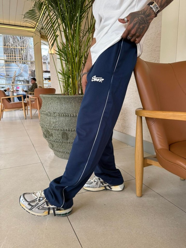 Lacivert renkte, bol kesim ve fermuarlı ceplere sahip erkek eşofman altı, denim kumaştan üretilmiş spor ve rahat bir görünüm sunar. ♂️