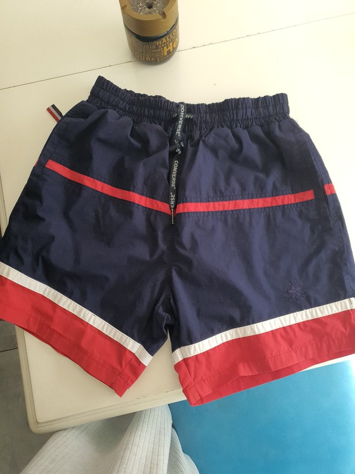 Lacivert renkte, bordo ve beyaz çizgili erkek deniz şortu. Ayarlanabilir lastikli bel ve bağcık bulunur. XS beden